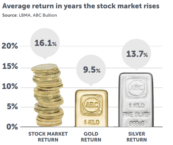 Silver has varied sources of industrial demand. This means silver often performs well when the economy is growing, and the stock market is rising. This can be seen in the chart below, which shows the performance of stocks, gold, and silver, in years the stock market goes up.