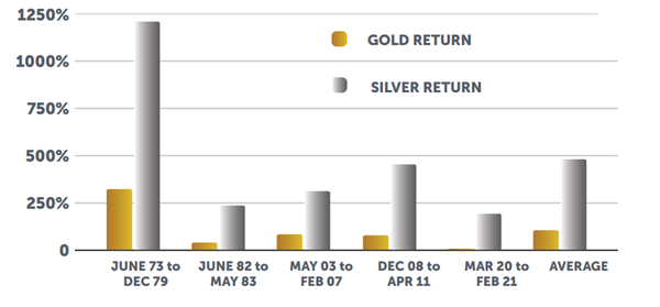In high inflation environments, gold has delivered average annual gains of 15%. For silver, the number is 18% per annum, with protection against rising prices a key reason to include silver in a portfolio.