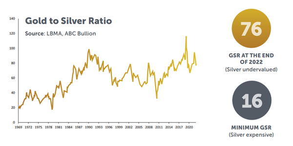 The Gold to Silver Ratio (GSR) measures how many ounces of silver are needed to equal an ounce of gold. The lower the GSR, the more expensive silver is relative to gold, while a higher the GSR indicates silver is undervalued relative to gold. The GSR ended 2022 at 76, suggesting silver remains extremely undervalued today.