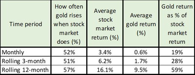 Our findings demonstrate that gold more often than not rises when the stock market rises (just over 50% of the time on a monthly and rolling 3-month basis, and 57% of the time on a rolling 12-month basis).