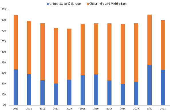 The chart below looks at the percentage of total bar and coin demand in each year that has come from the United States and Europe (averaged 27% over this entire time period) vs. the share that has come from China, India and the Middle East (averaged 51% over this entire time period).