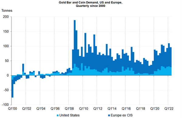 This can be seen in the chart below, which was shared by the World Gold Council’s Chief Market Strategist John Reade. It shows more than 20 years-worth of gold bar and coin demand in the United States and Europe.